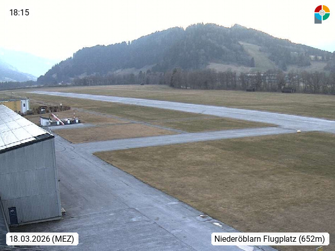 A 8960 Niederöblarn 679m, im oberen Ennstal im Bezirk Liezen. Blick vom Dach des Betriebsgebäudes der Club Sportunion Niederöblarn Richtung West auf den Flugplatzbereich der Alpenflugschule mit Vorfeld und Landebahn. Präsentiert von https://www.sportsarea.at/.