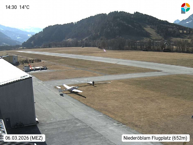 A 8960 Niederöblarn 679m, im oberen Ennstal im Bezirk Liezen. Blick vom Dach des Betriebsgebäudes der Club Sportunion Niederöblarn Richtung West auf den Flugplatzbereich der Alpenflugschule mit Vorfeld und Landebahn. Präsentiert von https://www.sportsarea.at/.