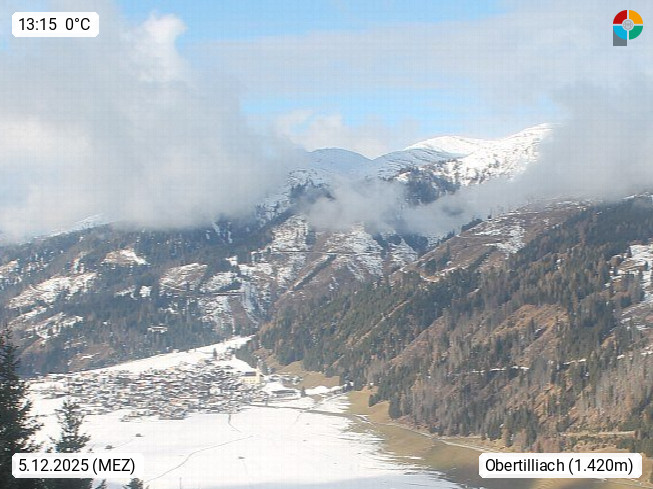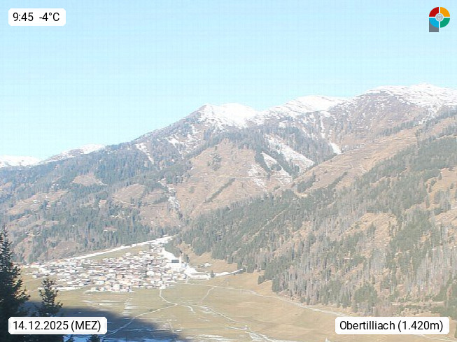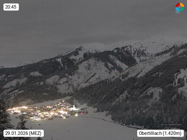 A 9942 Obertilliach 1.450m, Bergsteigerdorf im oberen Tiroler Lesachtal am Fuße des Golzentipp 2.317m, zwischen Lienzer Dolomiten und Karnischen Alpen nahe dem Kartitscher Sattel. Blick über die unverwechselbare Tilliacher Feldflur und das seit 1978 denkmalgeschütze Haufendorf Obertilliach. Präsentiert von https://www.osttirol.com.