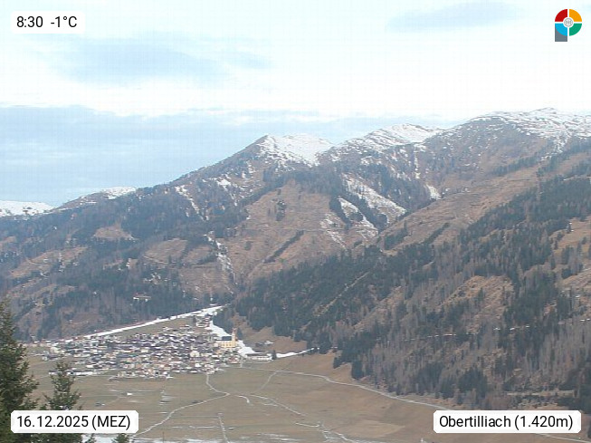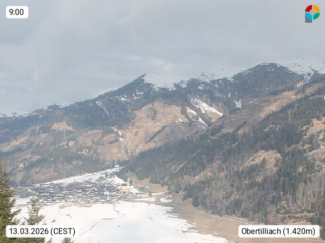 A 9942 Obertilliach 1.450m, Bergsteigerdorf im oberen Tiroler Lesachtal am Fuße des Golzentipp 2.317m, zwischen Lienzer Dolomiten und Karnischen Alpen nahe dem Kartitscher Sattel. Blick über die unverwechselbare Tilliacher Feldflur und das seit 1978 denkmalgeschütze Haufendorf Obertilliach. Präsentiert von https://www.osttirol.com.