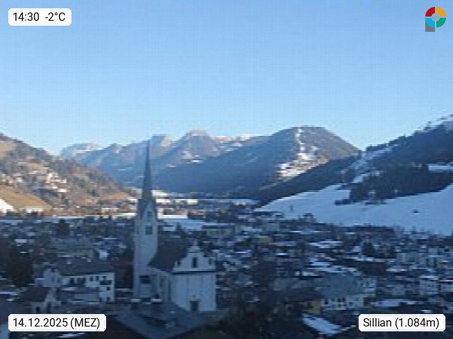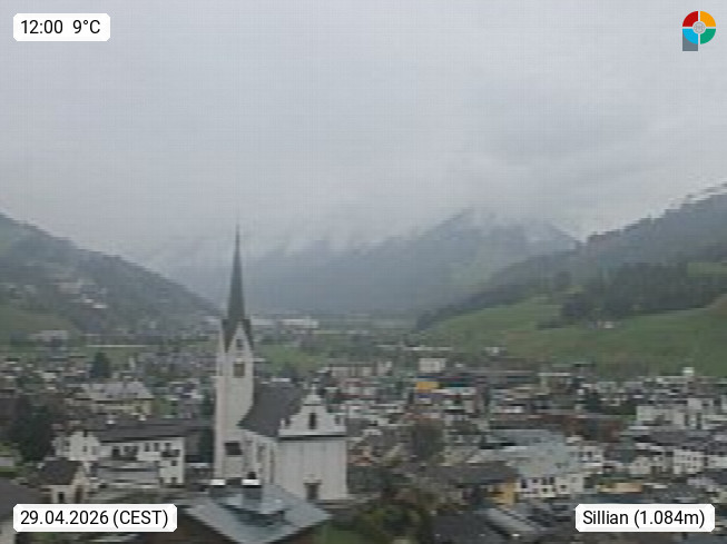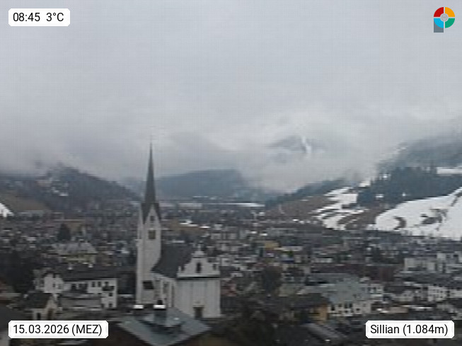 A 9920 Sillian 1.103m, Marktgemeinde im Hochpustertal an der Grenze zu Südtirol. Sillian zählt zu den Orten mit den meisten Sonnenstunden in Österreich. Blick Richtung Osten über den Ort Sillian mit der Pfarrkirche Maria Himmelfahrt zu den Lienzer Dolomiten. Präsentiert von https://www.megacam.at/.