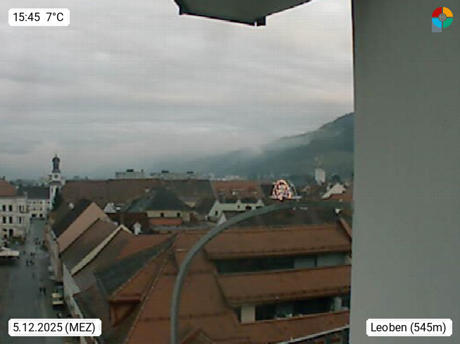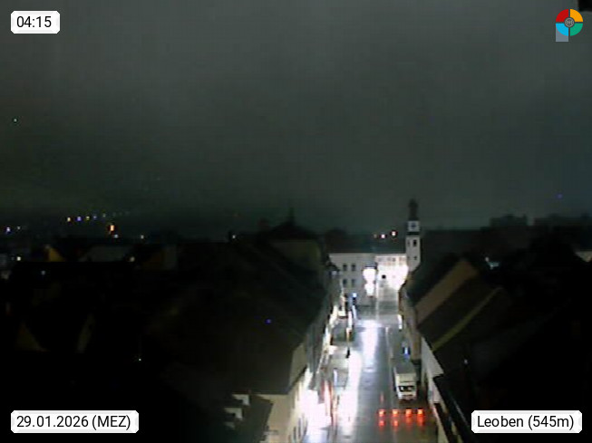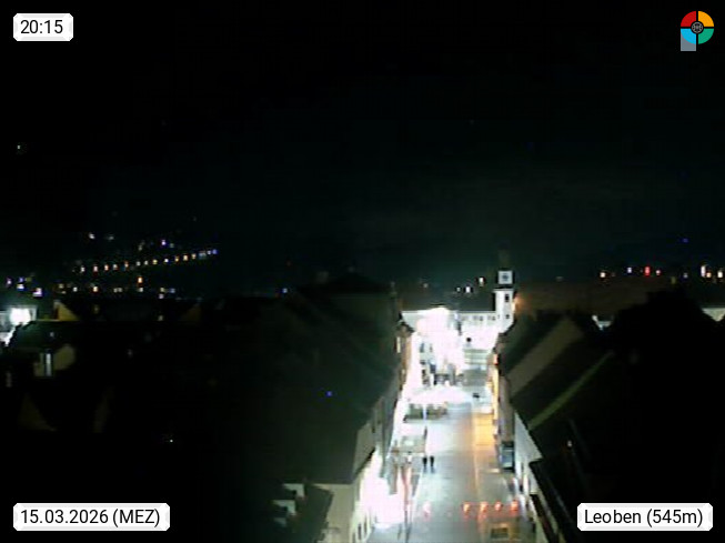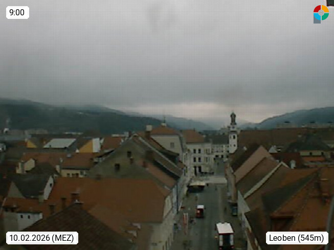 A 8700 Leoben 542m, Sitz der Montanuniversität Leoben und wirtschaftliche Zentrum der Obersteiermark im mittleren Murtal. Blick Richtung Westen zum Hauptplatz im Stadtzentrum. Präsentiert von https://www.schwammerlturm.com.