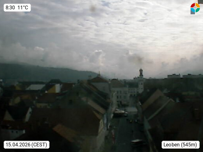 A 8700 Leoben 542m, Sitz der Montanuniversität Leoben und wirtschaftliche Zentrum der Obersteiermark im mittleren Murtal. Blick Richtung Westen zum Hauptplatz im Stadtzentrum. Präsentiert von https://www.schwammerlturm.com.