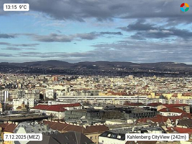 1100 Wien 192m, Bundeshauptstadt und zugleich eines der neun Bundesländer Österreichs im nordwestlichen Bereich des Wiener Beckens an der Donau. Blick vom Wasserturm auf der Kuppe des Wienerberges in Favoriten Richtung West über die Stadt entlang des Wiener Grürtels bis zum Kahlenberg 484m und Leopoldsberg 425m. Präsentiert von https://www.wien.gv.at/.