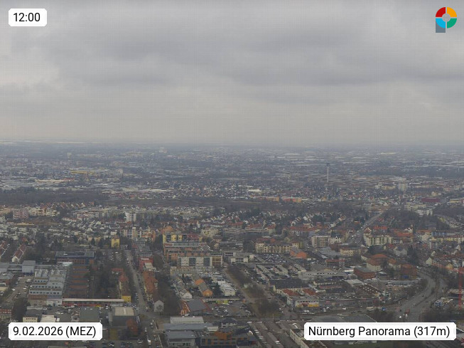 D 90402 Nürnberg 310m, kreisfreie Großstadt und zweitgrößte Stadt Bayerns im Regierungsbezirk Mittelfranken. Panoramablick vom Fernmeldeturm auf 193 m Höhe Richtung Norden über die Stadt. Präsentiert von https://www.schmitt-aufzuege.de.