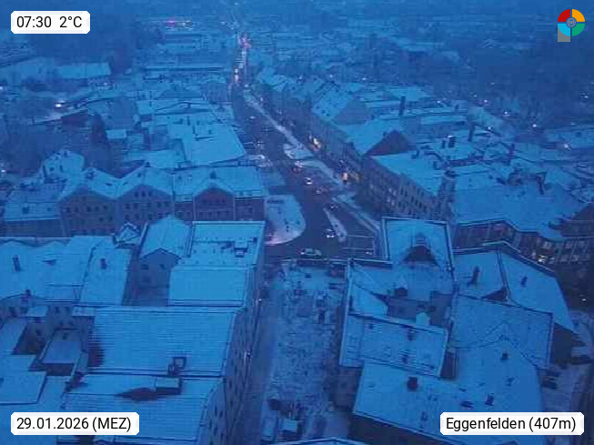 D 84307 Eggenfelden 416m, Stadt im sanften Tal der Rott. Blick vom Turm der Stadtpfarrkirche Richtung Süden über den Stadtplatz. Präsentiert von https://www.eggenfelden.de/de/.