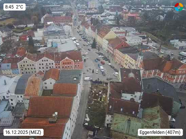 D 84307 Eggenfelden 416m, Stadt im sanften Tal der Rott. Blick vom Turm der Stadtpfarrkirche Richtung Süden über den Stadtplatz. Präsentiert von https://www.eggenfelden.de/de/.
