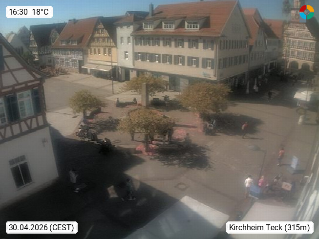 D 73230 Kircheim unter Teck 312m, Große Kreisstadt im Landkreis Esslingen nördlich des Albtraufs und dessen Vorbergen Teck, Breitenstein und Limburg. Blick Richtung Norden über den Marktplatz. Präsentiert von https://www.kirchheimer.info/.