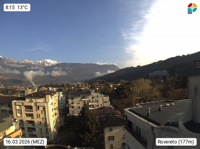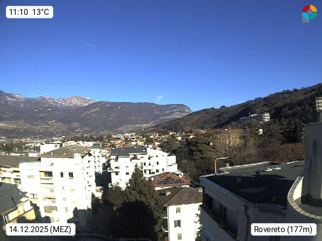 I 38068 Rovereto 175m, Stadt im Trentiner Etschtal am Leno, südlich von Trient. Blick über das Etschtal Richtung Südwest. Von der Brennerautobahn A22 Ausfahrt Rovereto Süd, fährt man zum nahe gelegenen Gardasee. Präsentiert von https://www.meteorovereto.it.