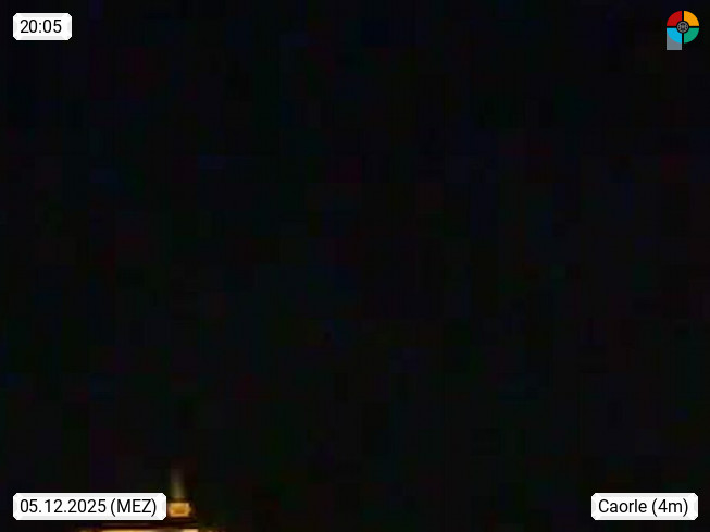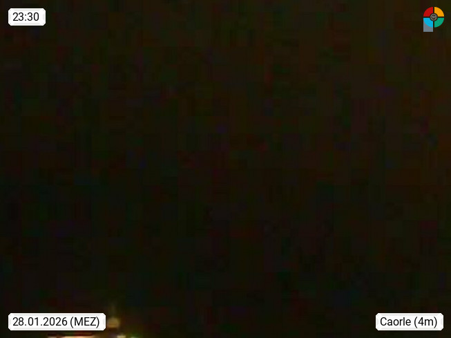 I 30021 Caorle 2m, Stadt in der Provinz Venedig am Fluss Livenza. Caorle mit seinen schmalen Gassen, seinen Glockentürmen und den mit typisch venezianischen Farben gestrichenen Häusern wird oft \"Klein Venedig\" genannt. Blick Richtung Süd über den Strand und Kirche Madonna del Angelo zur Adria. Präsentiert von http://www.aparthotelvillaolga.it.