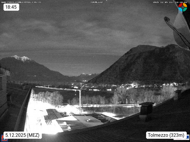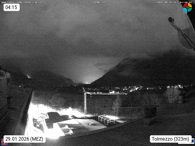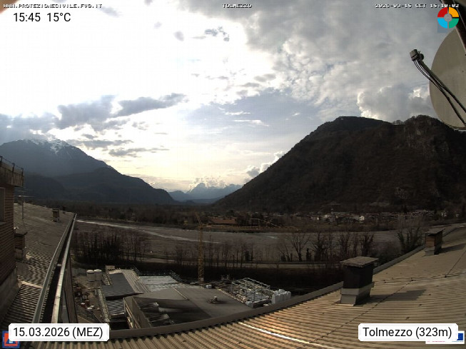 I 33028 Tolmezzo 323m am Fluss Tagliamento in Friaul und Hauptort der historischen Region Karnien. Blick Richtung Westen über den Tagliamento, links der Mount Verzegnis, das Tal des Tagliament mit dem Ort Ampezzo. Im Vordergrund die Stadt Caneva. Präsentiert von https://www.meteo.fvg.it/.