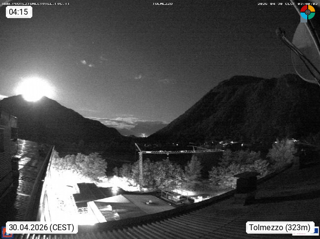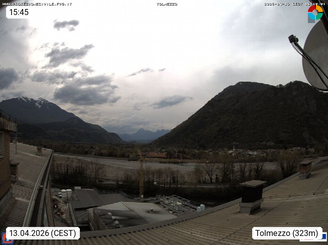I 33028 Tolmezzo 323m am Fluss Tagliamento in Friaul und Hauptort der historischen Region Karnien. Blick Richtung Westen über den Tagliamento, links der Mount Verzegnis, das Tal des Tagliament mit dem Ort Ampezzo. Im Vordergrund die Stadt Caneva. Präsentiert von https://www.meteo.fvg.it/.