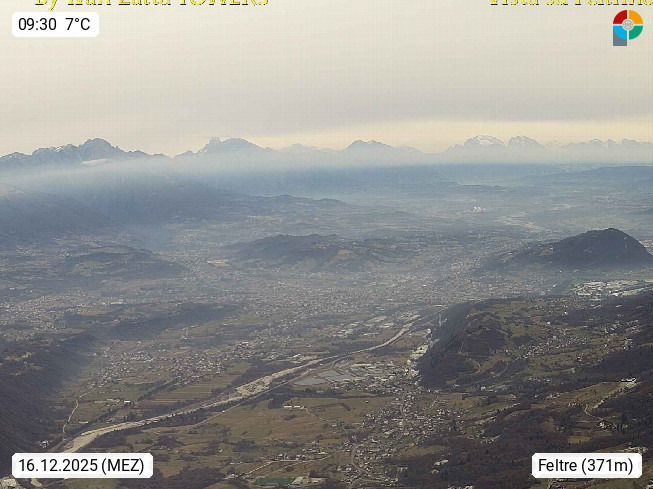 I 32032 Feltre 325m, Stadt in der Provinz Belluno an den Ausläufern der Dolomiten. Blick vom Monte Telva Richtung Westen über die Stadt. Präsentiert von http://www.arifeltre.it.