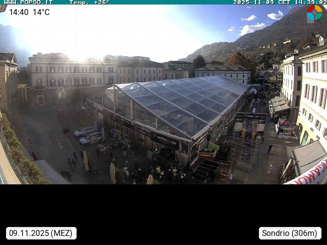 I 23100 Sondrio 360m an der Adda, Hauptort der italienischen Provinz Sondrio und größter Ort des Veltlin. Blick über den Hauptplatz Richtung Westen. Präsentiert von https://www.popso.it/home.