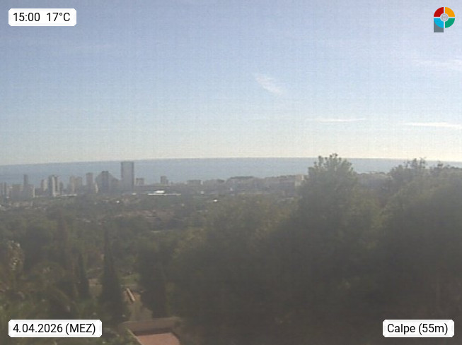 E 03710 Calp 59m, Stadt an der Costa Blanca zwischen Valencia und Alicante an der Ostküste Spaniens. Panoramablick Richtung Südost zum Mittelmeer. Präsentiert von http://www.meteocalpe.com.