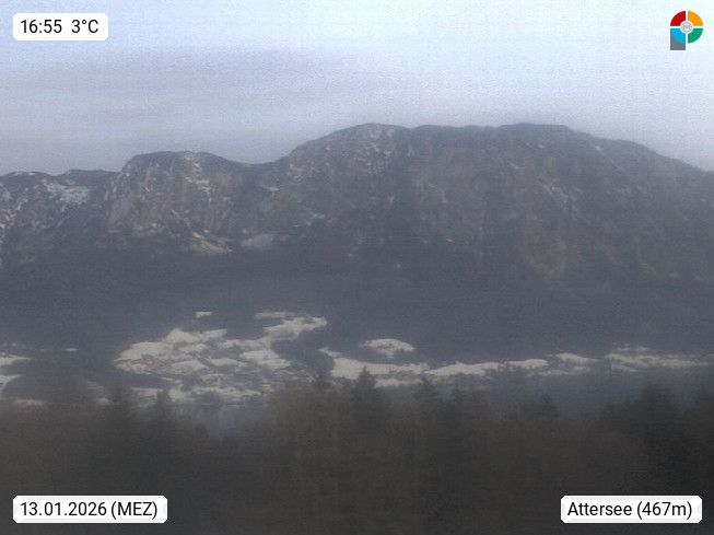 Attersee auch Kammersee ist mit 47 km² der größte Binnensee Österreichs mit einer Tiefe von bis zu 171m und liegt im Salzkammergut. Blick Richtung Osten über den See. Präsentiert von https://www.aichereben.at/.