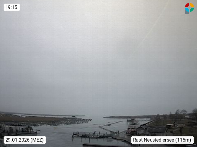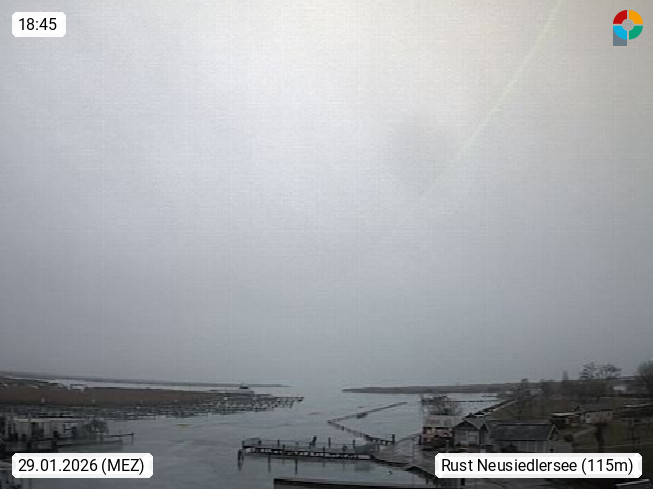 A 7071 Rust am Neusiedlersee 124m, ung. Ruszt, kroat. Rusta ist mit rund 1.900 Einwohnern der kleinste Verwaltungsbezirk und die kleinste Statutarstadt Österreichs. Bekannt ist Rust vor allem als Stadt der Störche und als Weinbaugemeinde. Blick vom Segelhafen Richtung Osten über den See. Präsentiert von https://www.seebadrust.at/.
