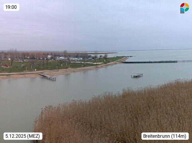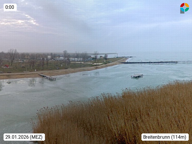 AT 7091 Breitenbrunn am Neusiedlersee 140 m, Marktgemeinde mit 25,75 km² im Bezirk Eisenstadt Umgebung. Blick Richtung Nordost über das Seebad am Neusiedlersee. Präsentiert von https://www.neuerstrand.at.