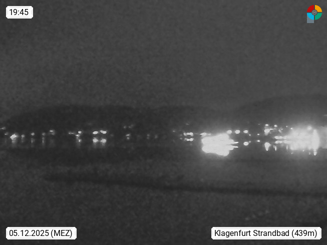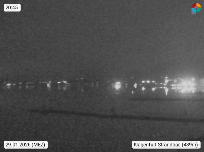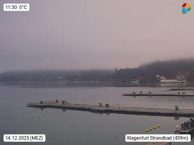 A 9020 Klagenfurt am Wörthersee 445m, Landeshauptstadt von Kärnten im Kärntner Unterland am Ostufer des Wörthersees im Klagenfurter Becken. Blick vom Strandbad Klagenfurt, dem größten Binnenseebad Europas, welches 1924 eröffnet wurde.Blick in Richtung Norden auf die Badestege und den Strand. Präsentiert von https://www.klagenfurt.at:443/.