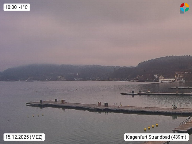 A 9020 Klagenfurt am Wörthersee 445m, Landeshauptstadt von Kärnten im Kärntner Unterland am Ostufer des Wörthersees im Klagenfurter Becken. Blick vom Strandbad Klagenfurt, dem größten Binnenseebad Europas, welches 1924 eröffnet wurde.Blick in Richtung Norden auf die Badestege und den Strand. Präsentiert von https://www.klagenfurt.at:443/.