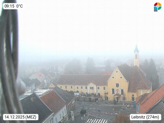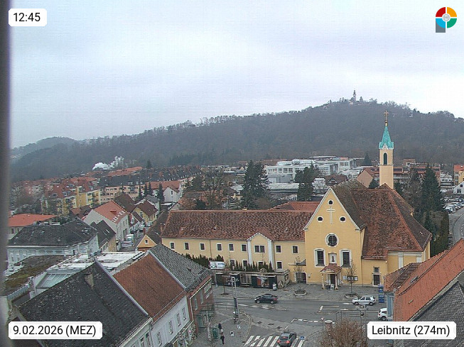 A 8430 Leibnitz 275m, Bezrikshauptstadt in der Südsteiermark zwischen den Flüssen Mur und Sulm im Leibnitzer Feld. Blick vom Turm des Rathauses über den Hauptplatz Richtung Westen. Präsentiert von https://leibnitz.info/de.