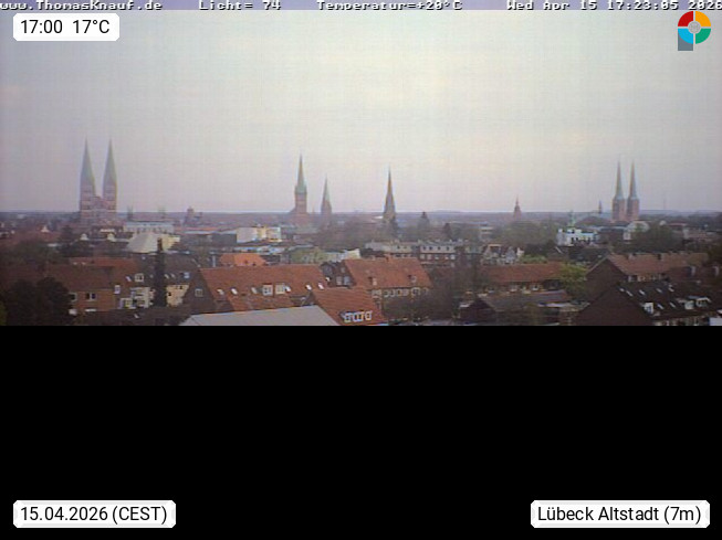 D 23552 Lübeck 15m, Hansestadt im Südosten von Schleswig Holstein an der Ostsee, Lübecker Bucht. Blick Richtung Osten über die historische Altstadt von Lübeck mit der Petrikirche und Marienkirche. Präsentiert von http://thomasknauf.de.