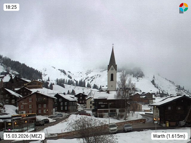 A 6767 Warth 1.495m, Wintersportort im Bregenzerwald am Übergang zum Tiroler Lechtal. Blick Richtung Nordosten über den Ort zum Biberkopf 2.599m. Präsentiert von https://www.walserberg.at/.