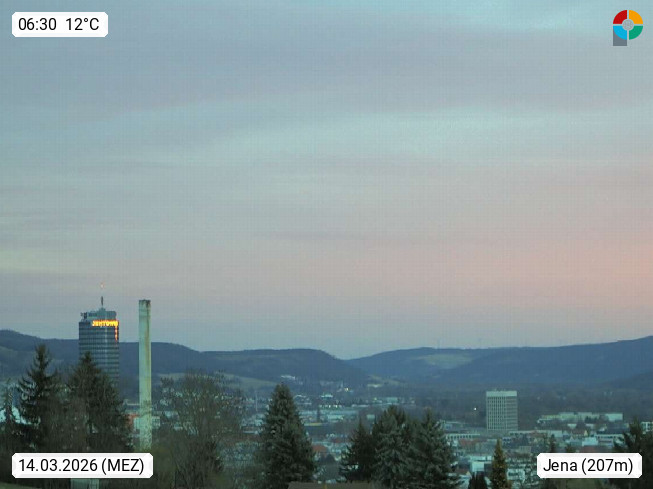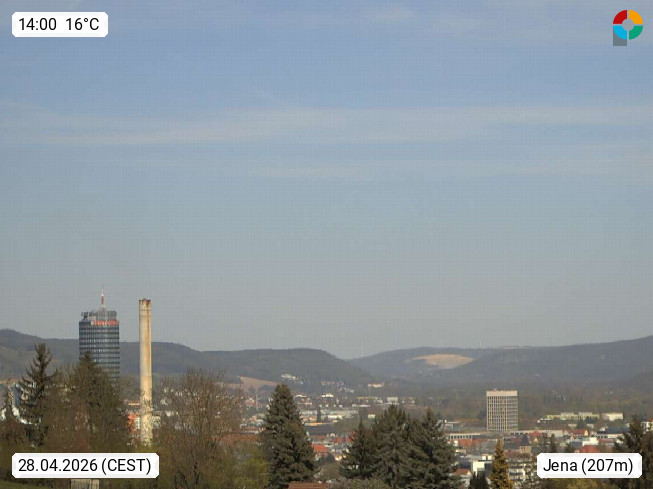 D 07745 Jena 143 an der Saale, Universitätsstadt und kreisfreie Großstadt in Thüringen und bekannt durch die Carl Zeiss Werke. Panoramablick vom Max Planck Institut, Richtung Nordost zum Stadtzentrum. Präsentiert von https://www.bgc-jena.mpg.de/wetter/.