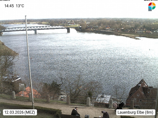 D 21481 Lauenburg an der Elbe 49m, Kleinstadt im Kreis Herzogtum Lauenburg und südlichste Stadt Schlewig-Holsteins rund 40 km südöstlich von Hamburg an der Elbe. Blick flussabwärts Richtung Westen über die Elbe. Präsentiert von https://www.lauenburg.de/.