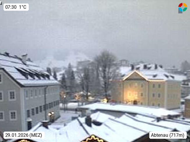 5441 Abtenau 715m, Marktgemeinde im Lammertal im Tennengau rund 45 km südlich von Salzburg. Blick Richtung Südwest über den Marktplatz, im Hintergrund das Tennengebirge. Präsentiert von https://goldenerstern.at/.