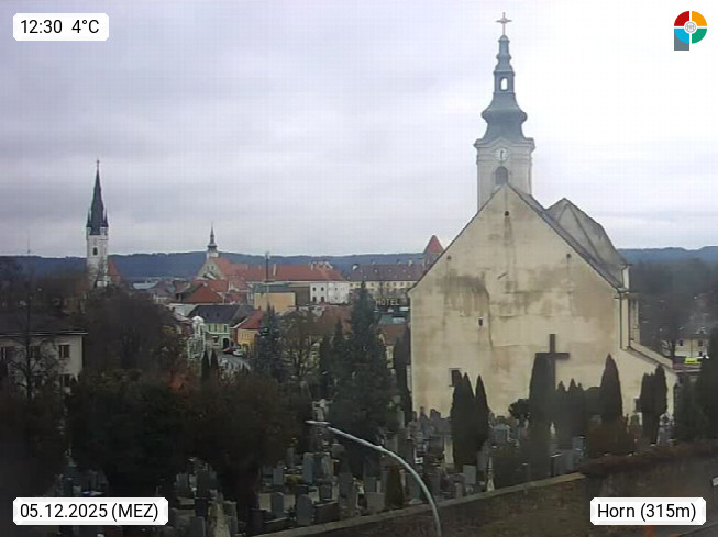 3580 Horn 320m, Bezirkshauptstadt an der Taffa im östlichen Waldviertel in Niederösterreich. Blick Richtung Osten zur Stephanskirche welche im 11. Jahrhundert als Wehrkirche errichtet wurde. Präsentiert von https://www.netcamera.org/.