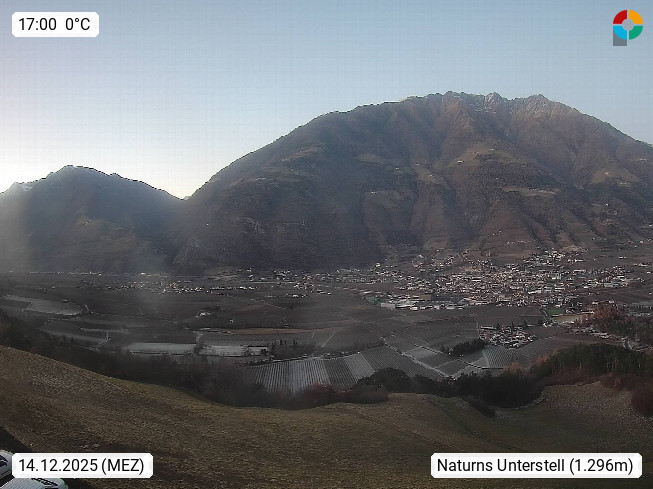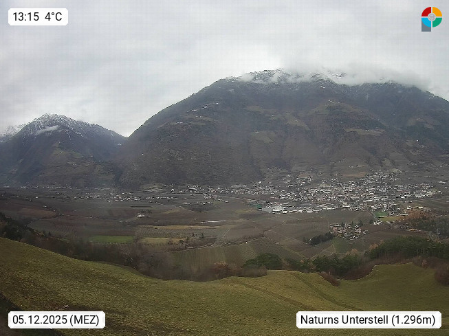 I 39025 Naturns (Naturno) 560m bei Meran (Merano), im Bezirk Burggrafenamt (Burgraviato). Blick von der Bergstation der Unterstellseilbahn zum Ort Naturns - Naturno, im Hintergrund der Naturnser Nörderberg (Monte Tramontana). Präsentiert von https://www.merano-suedtirol.it/de/naturns.html.