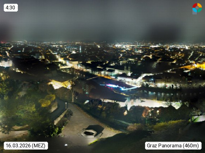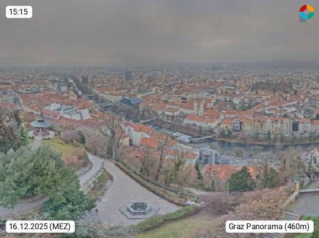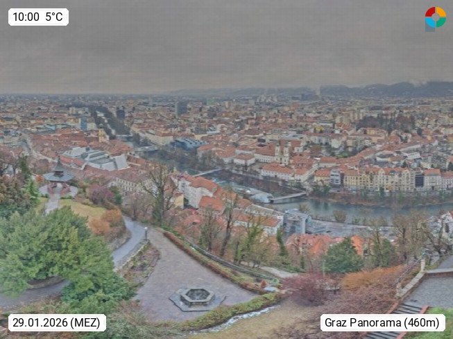 AT 8010 Graz Landeshauptstadt des Bundeslandes Steiermark an der Mur im Grazer Becken. Graz ist mit rund 300.000 einwohnern die zweitgrößte Stadt Österreichs. Panoramablick vom Schlossberg über den Süden von Graz. Präsentiert von https://www.graz.at.