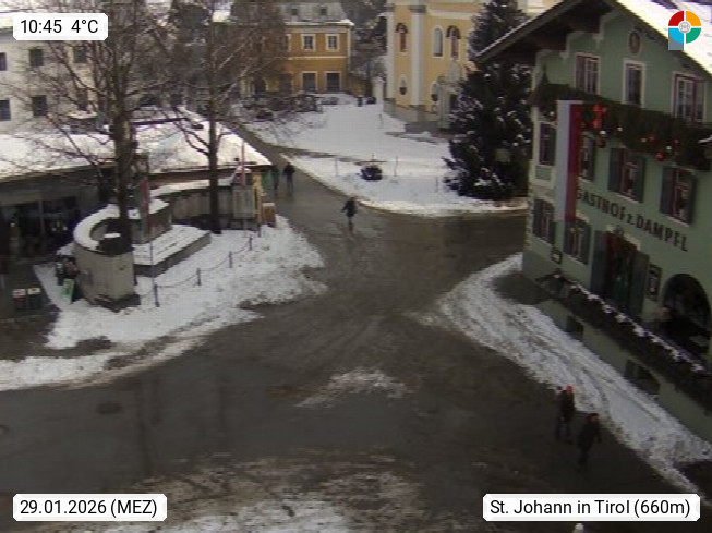 6380 St. Johann in Tirol ist eine Marktgemeinde mit 9547 Einwohnern im österreichischen Bundesland Tirol im Bezirk Kitzbühel. Blick auf den St. Johanner Hauptplatz auf einer Seehöhe von 665 Metern. Präsentiert von https://www.ortswaerme.info/.