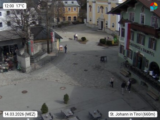 6380 St. Johann in Tirol ist eine Marktgemeinde mit 9547 Einwohnern im österreichischen Bundesland Tirol im Bezirk Kitzbühel. Blick auf den St. Johanner Hauptplatz auf einer Seehöhe von 665 Metern. Präsentiert von https://www.ortswaerme.info/.