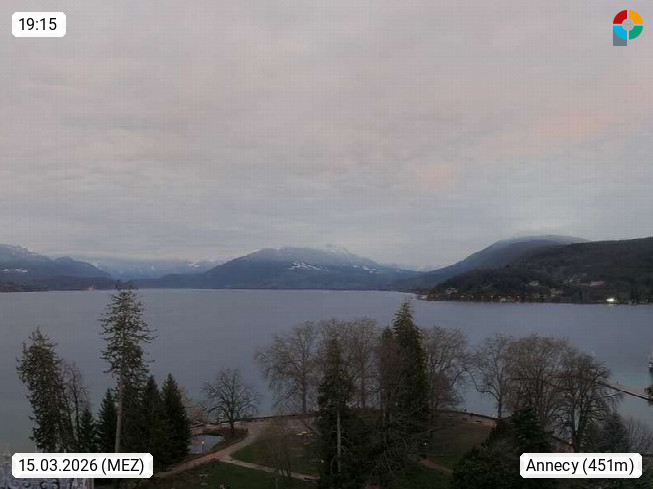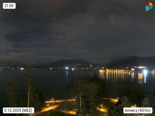 74000 Annecy ist eine ostfranzösische Stadt mit 128.199 Einwohnern und die Hauptstadt des Départements Haute-Savoie in der Region Auvergne-Rhône-Alpes. Blick auf den See. Präsentiert von https://www.meteo-annecy.com/.
