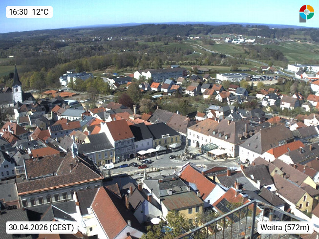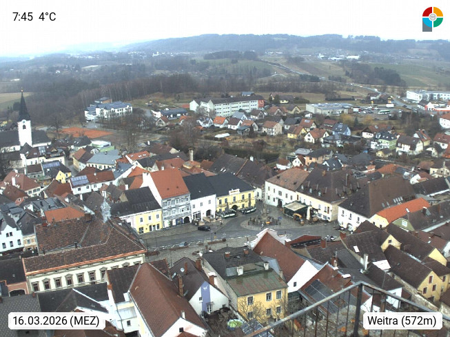 3970 AT 3970 Weitra 570m an der Lainitz im Waldviertel, Weitra gilt als älteste Braustadt Österreichs und befindet sich im Berzirk Gmünd. Panoramablick vom Schlossturm Richtung Norden. Präsentiert von https://www.braustadt2021.at/home/.