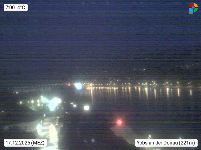 AT 3370 Ybbs an der Donau 223 m, Stadt im Mostviertel an der Donau gelegen im Berzik Melk. Blick donauaufwärts zum Kraftwerk und Schiff Schleuse Persenbeug. Präsentiert von https://www.ybbs.gv.at.