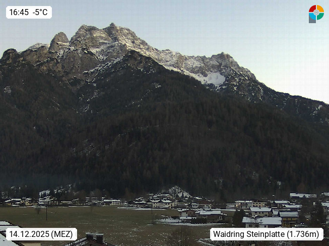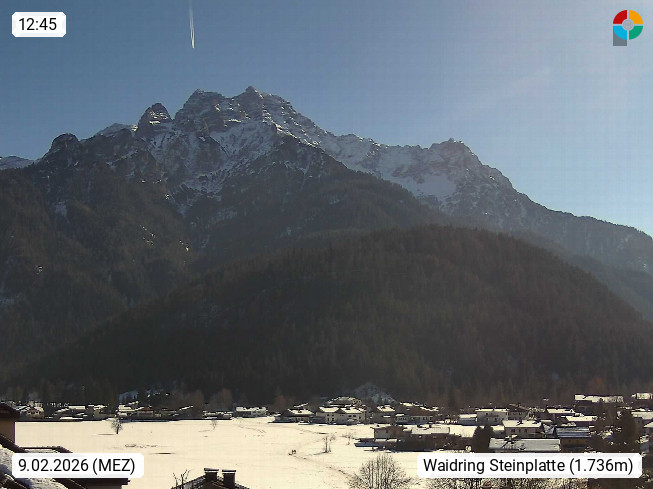 AT 6384 Waidring 780m, am Beginn des Pillersee Tal am Fuße der Loferer Steinberge im Dreiländereck Tirol - Bayern - Salzburg. Blick vom Ort Richtung Norden zur Steinplatte 1.869m in den Chiemgauer Alpen. An der Nordseite befindet sich das Familienskigebiet Steinplatte - Winklmoosalm welches von Waidring mit einer Godelbahn erschlossen ist. Präsentiert von https://www.tiroler-adler.at/.