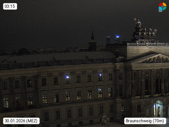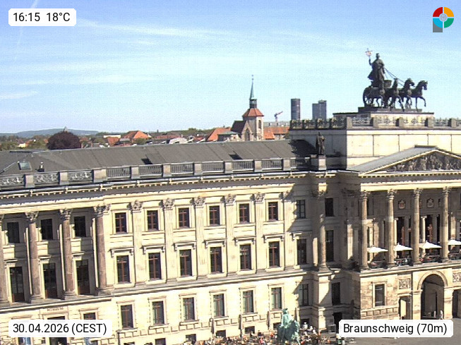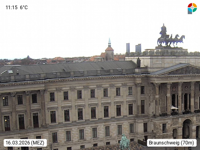 D 38100 Brunswick 78m, is a city at Oker river in the southeast of the German state Lower Saxony in the northern Harz region. View from City Hall on the southeast direction over Bohlweg to the castle with the Quadriga on the portal and the equestrian statues on the castle-square. Presented by https://www.braunschweig.de.