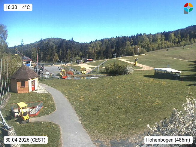 D 93453 Neukirchen at Heiligen Blut, view near Hohenbogen, an 8km long mountain range in the Bavarian Forest in rural district Cham in the administrative region Upper Palatinate. Panoramic view from the valley station of the Hohenbogen cable car 657m to Peak Ahornriegel 1.050m. Presented by https://hohenbogen.de/.