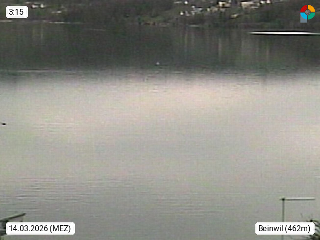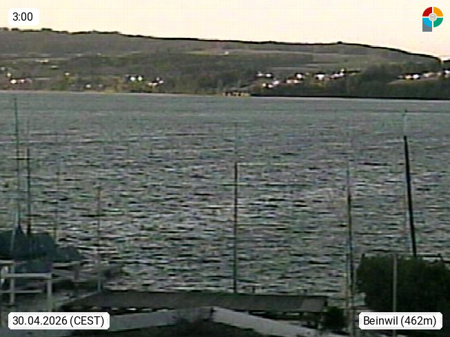 CH 5712 Beinwil am See 521m, lies in the Seetal valley at the western shore of Lake Hallwillersee in the district Kulm in canton Aargau at the border to the canton Lucerne. Panoramic view in southeast direction over Lake Hallwillersee 449m. Presented by https://www.webcam-hallwilersee.ch/.