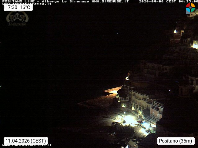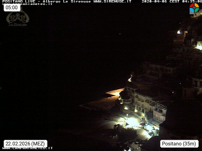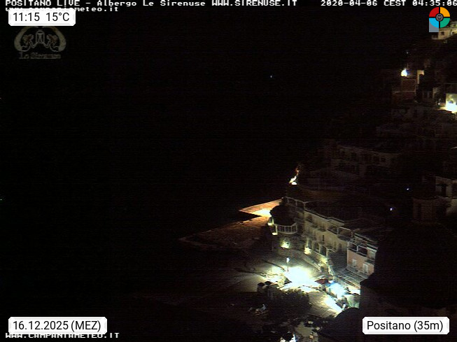 I 84017 Positano 26m, lies at the Gulf of Salerno at the Amalfi Coast in the south of Naples in the province Salerno in region Campania. Panoramic view in west direction to the houses of the village at the Tyrrhenian Sea. Presented by https://sirenuse.it/en.