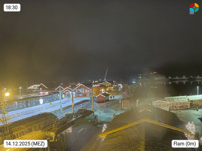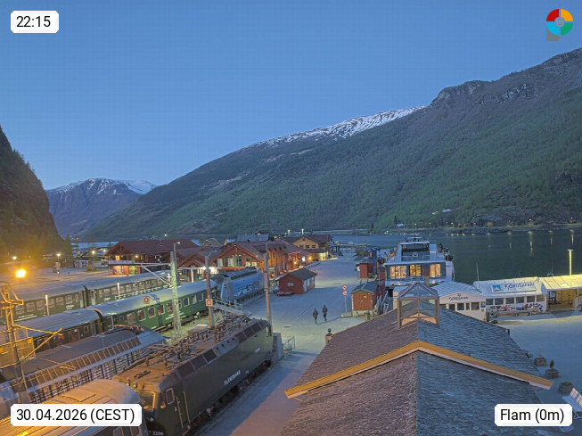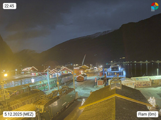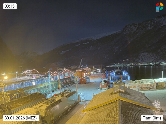 NO 5742 Flam (FlÄm) at Aurlandsfjord is a tourism village, which belongs to the municipality Aurland in the province (Fylke) Sogn og Fjordane on the 204 km long Sognefjord. The Sognefjord is the longest Fjord in Europe and with 1.308m also the deepest one of the world. It is branching in many little anabranches like e.g. the Aurlandsfjord, the Lustrafjord or the Naerofjord, the most narrow fjord of Europe. Panoramic view in north direction to the landing stage. Presented by https://www.visitflam.com/.