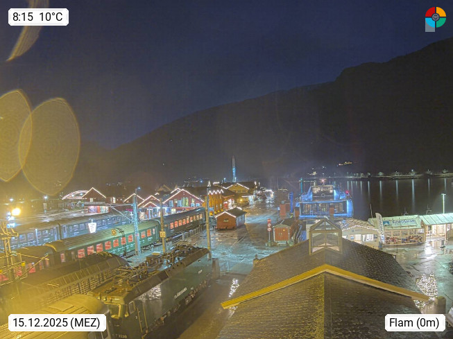 NO 5742 Flam (FlÄm) at Aurlandsfjord is a tourism village, which belongs to the municipality Aurland in the province (Fylke) Sogn og Fjordane on the 204 km long Sognefjord. The Sognefjord is the longest Fjord in Europe and with 1.308m also the deepest one of the world. It is branching in many little anabranches like e.g. the Aurlandsfjord, the Lustrafjord or the Naerofjord, the most narrow fjord of Europe. Panoramic view in north direction to the landing stage. Presented by https://www.visitflam.com/.