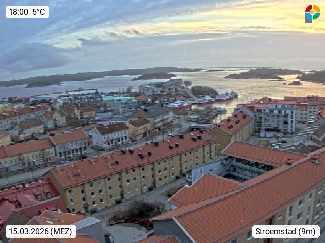 S 45280 Stroemstad 8m, town in the Province Vaestra Goetalands laen and the district Bohuslaen. Stroemstad is a border town to Halden in Norway. Panoramic view over the harbour to the Skagerrak strait. PROMOTED BY http://www.panocams.se. Presented by https://www.stromstad.se.