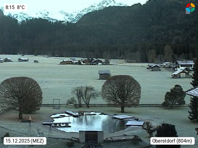 D 87561 Oberstdorf 815m, climatic spa in the Swabian rural district Oberallgaeu in the Allgaeuer Alps, most southern municipality of Germany and according to area third largest municipality of Bavaria. Panoramic view in south direction to the Allgaeuer Alps. Presented by https://www.schueles.com/.