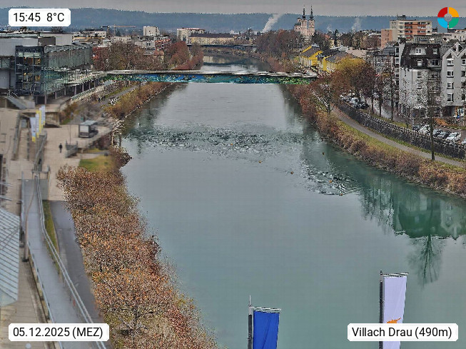 A 9500 Villach 501m, view from the city centre in southeast direction over the river Drava to the Karawanken Mountains with Mount Mittagskogel 2.143m. Presented by https://www.visitvillach.at.