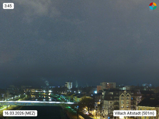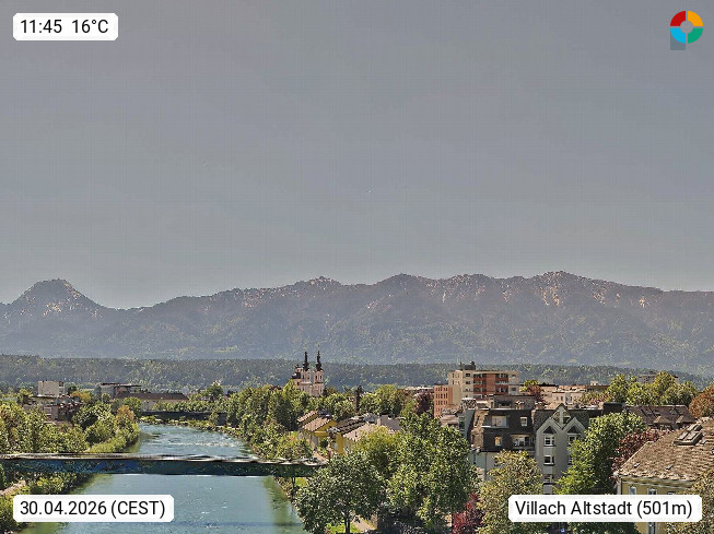 A 9500 Villach 500m, view in south direction over the Bridge Draubruecke to the old town. In the background are the foothills of the Karawanken Mountains. Presented by https://www.visitvillach.at.