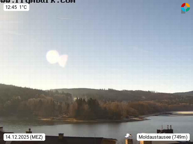 Lipno Lake (Lipno Udolni nadrz), 558m, panoramic view in west direction over the Vltava storage lake (Lipno dam) 46,5 km² at the border to Austria. PROMOTED BY http://www.panocams.cz. Presented by https://www.frymburk.com/rekreace/.